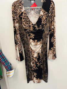 Stretch knit v-neck dress w/ ruching down front and back, long bell sleeves